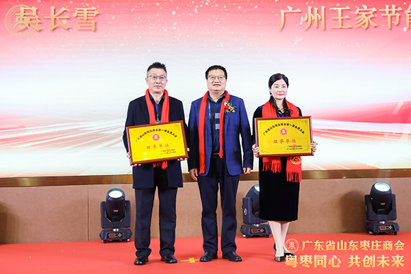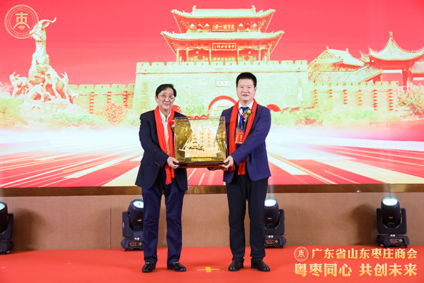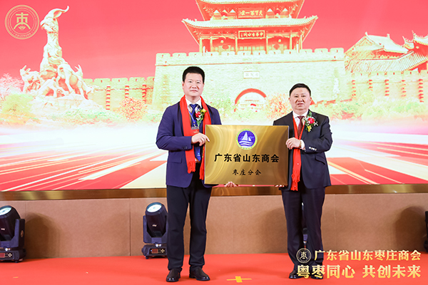枣庄市政府左文副市长为广东省山东枣庄商会王广军会长颁发牌匾