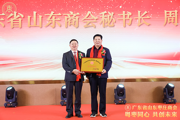 广东省山东商会周慎坤秘书长为广东省山东枣庄商会颁发广东省山东商会枣庄商会分会牌匾