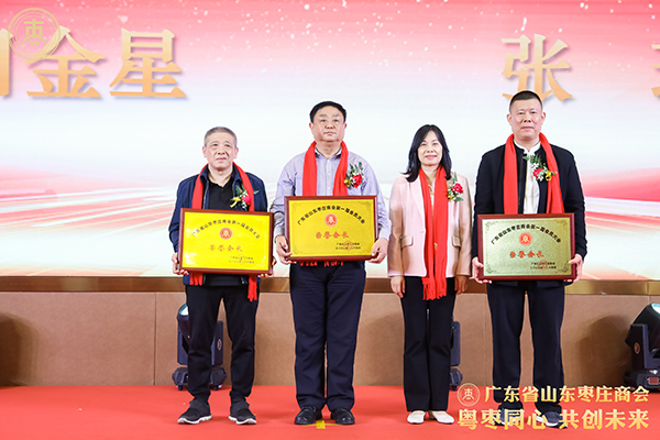 广东省工商联梁金仲副秘书长为广东省山东枣庄商会唐润清、田金星、邵桂生、张玮荣誉会长颁发牌匾