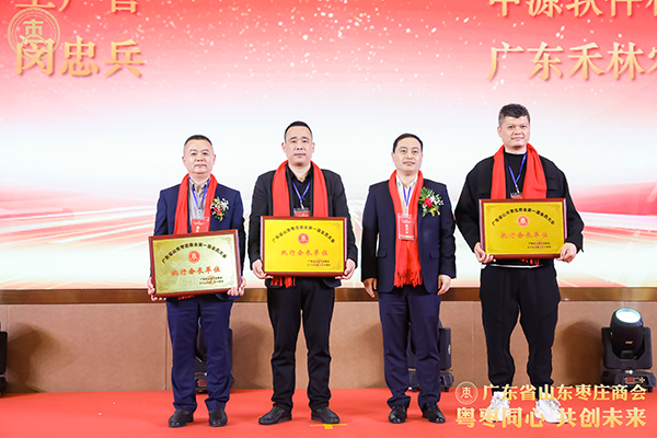 枣庄市政府杨会锋副秘书长为广东省山东枣庄商会执行会长:王广管、闵忠兵、高伟、周广锦颁发牌匾