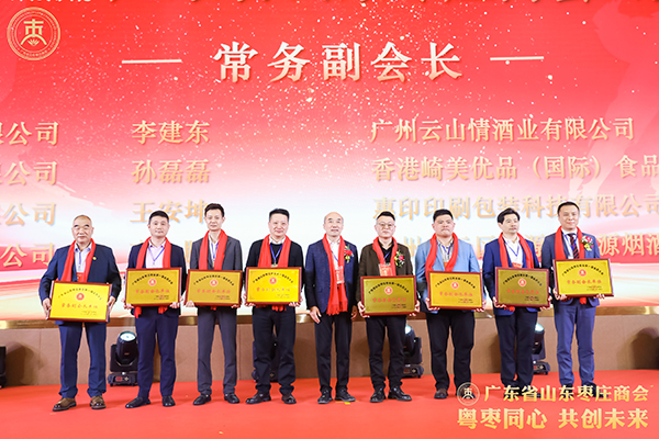 枣庄市市委统战部副部长、市工商联党委书记、常务副主席赵海涛为广东省山东枣庄商会常务副会长:李建东、孙磊磊、王安坤、施治生、刘强、龙锴、李腾、田伟颁发牌匾