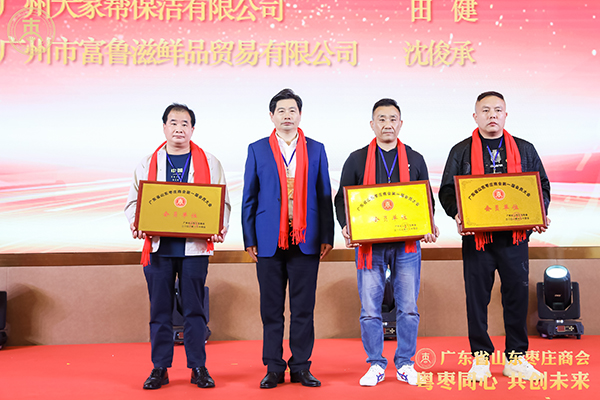 广东省工商联常委、广东省山东商会常务副会长、广东省沂蒙文化发展促进会会长王庆安为广东省山东枣庄商会理事:赵扬、吴长雪、朱洪志颁发牌匾