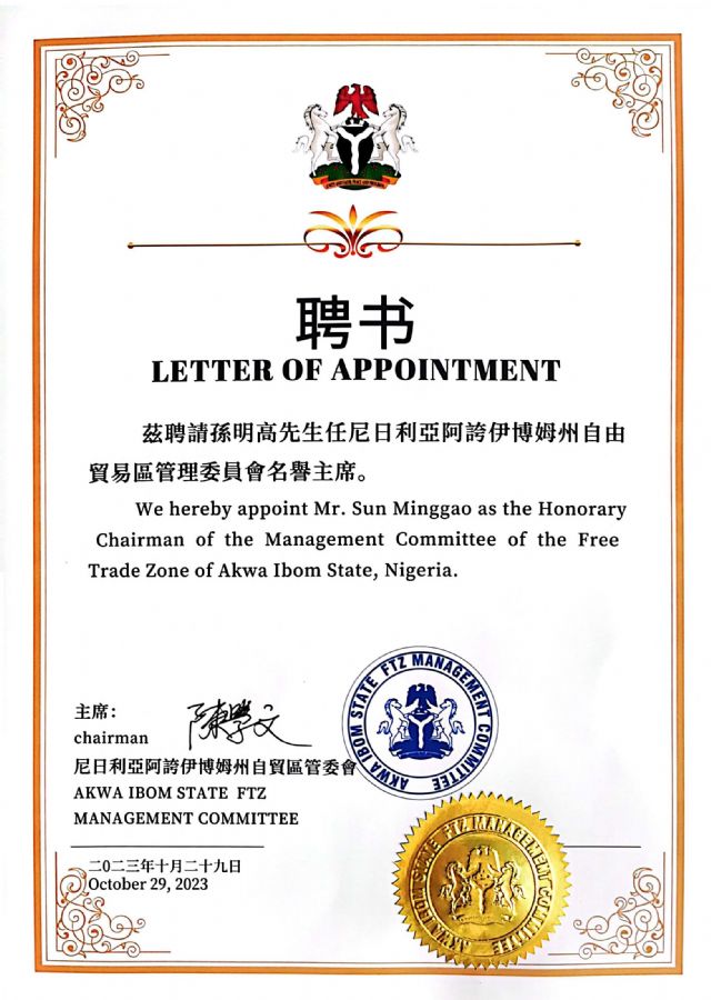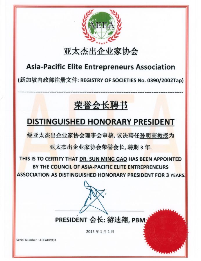 在国际NGO组织中,孙明高会长先后担任亚太杰出企业家协会荣誉会长、世界华商(非洲)联合会中非经济贸易促进会执行会长、美国中美艺术家基金会荣誉会长、中非经济贸易促进会执行会长、世界财富协会亚太分会常务理事、全球互通精英俱乐部副理事长、尼日利亚阿夸伊博姆州自由贸易区管理委员会名誉主席等职务。