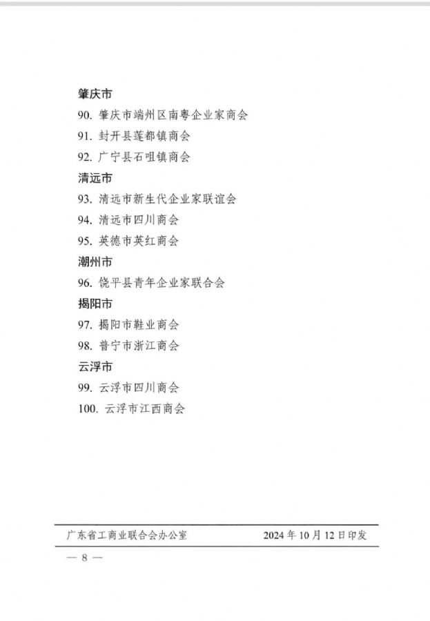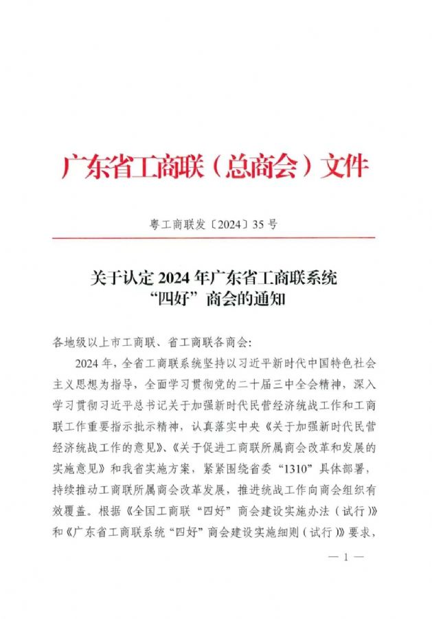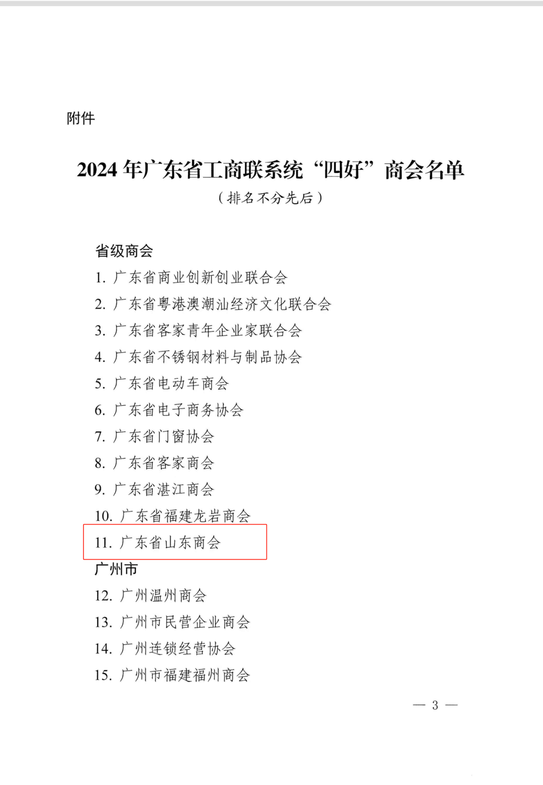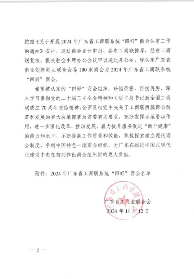 2024年11月14日,广东省工商联印发了《关于认定 2024年广东省工商联系统“四好”商会的通知》,经广东省工商联复核、提交驻会主席办公会议审议通过并公示,现认定广东省山东商会等100家商会为2024年广东省工商联系统“四好”商会。