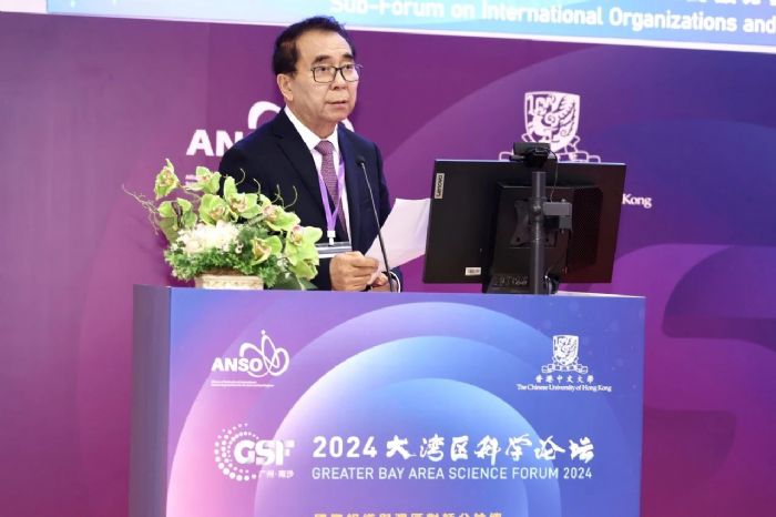 ▲大湾区科学论坛主席、中国科学院原院长、“一带一路”国际科学组织联盟创始主席、中国科学院院士白春礼发表主旨演讲