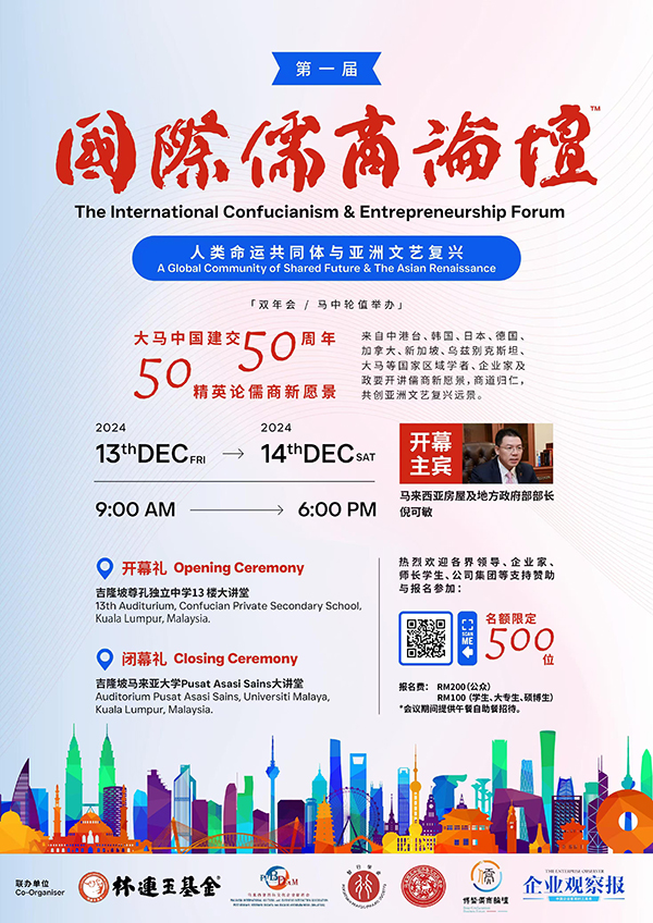 2024年12月13日至14日,第一届国际儒商论坛在马来西亚首都吉隆坡隆重举行。此次论坛吸引了来自中国、马来西亚、日本、韩国、新加坡、德国、加拿大、乌兹别克斯坦等国家的500多名学者和企业家齐聚一堂,围绕“人类命运共同体与亚洲文艺复兴”核心主题展开讨论。