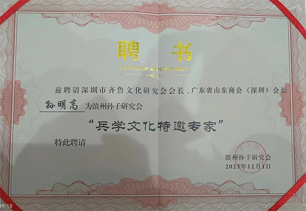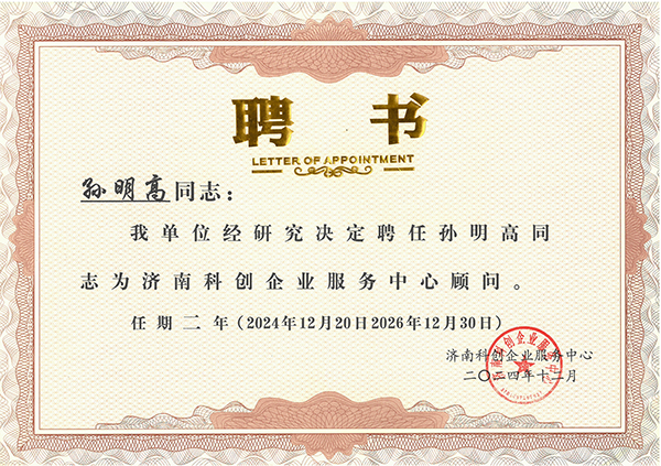 鉴于孙明高会长在商会建设、商会经营、商会创新、商会发展等方面的特殊贡献,在全国各个层次商协会的社会影响力,以及在为会员、为政府、为产业、为社会等方面做出的突出成绩。近日,济南科创企业服务中心聘请孙明高会长担任顾问。