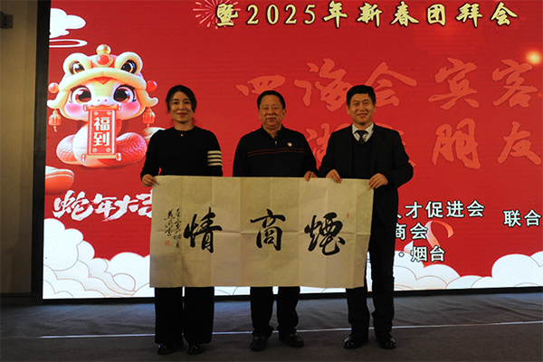 团拜会现场,烟台市退役军人军乐团以军乐合奏《祝您快乐+分离式进行曲》拉开序幕。北京烟台企业商会执行会长范永晶向烟台市金都商会会长董山赠送了象征兄弟商会情谊的纪念牌。国家一级美术师孙泳新,山东省鲁商联盟会大湾区鲁商工委名誉会长、东营市烟台商会会长栾庆民分别赠送了书法作品,为团拜会增添了文化气息。