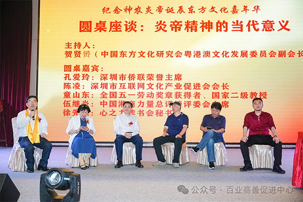 圆桌论坛共议炎帝精神当代价值中华诗词学会高校诗词工作委员会副主任贺贤赟主持《炎帝精神的当代意义》圆桌论坛,深圳市侨媛会主席孔爱玲、深圳信息职业技术学院教授童山东等嘉宾从文化、经济、社会等维度展开探讨,为现场观众带来思想盛宴。