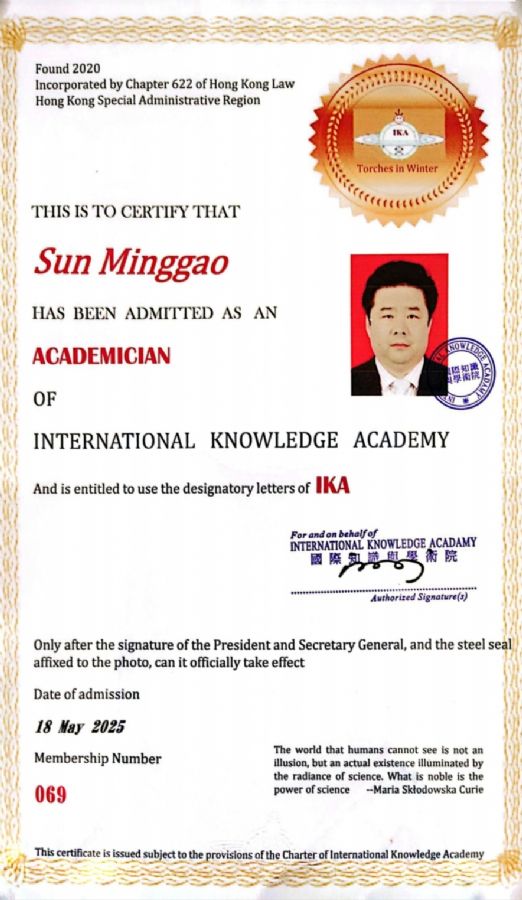 2025年5月22日,国际知识与学术院正式宣布,孙明高凭借其在学术研究、教育创新、科技发展和文化交流等多个方面的卓越成就与突出贡献,荣任国际知识与学术院院士。这一殊荣不仅是对他个人奋斗历程的高度认可,更是他多年来在学术道路上不懈探索、在教育领域默默耕耘、在科技前沿奋勇开拓、在文化传承中积极作为的有力见证。