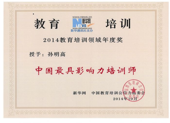 鉴于在教育培训、科技研发、人才培养等方面作出的突出贡献,孙明高先后荣获中国最具影响力培训师、中国管理咨询与培训年度人物、天津大学优秀校友工作者、土山中学优秀校友等多项教育界荣誉。