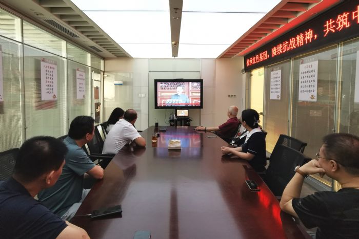 大会开始前半小时,在商会党支部书记张云珊的带领下,全体党员佩戴共产党员徽章入场,商会代表们整齐就座,通过高清直播画面集体观看纪念大会。