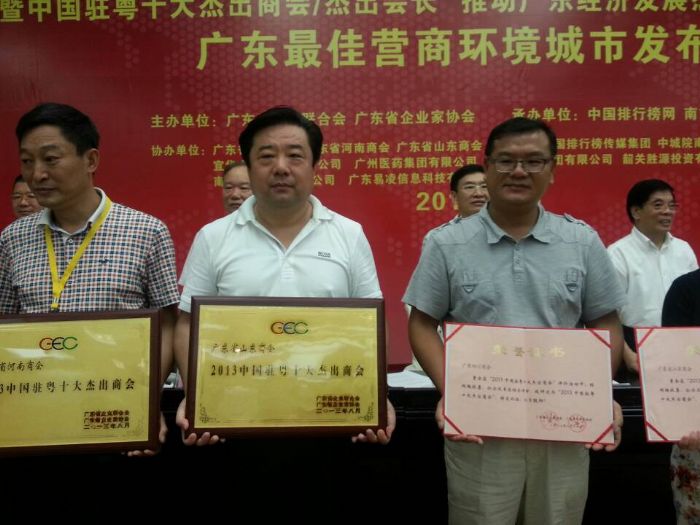 经过近三个月的投票评审,广东省山东商会与其他九个商会共同被评为“2013年中国驻粤十大杰出商会”。孙明高会长代表广东省山东商会上台领奖。