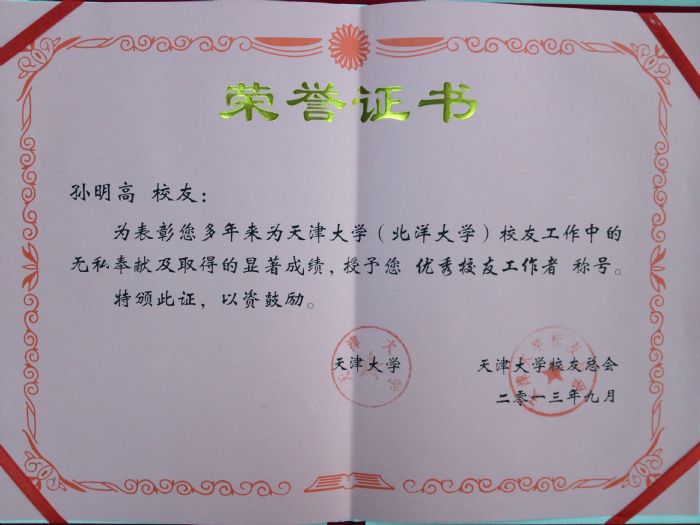 2013年9月,为表彰深圳市齐鲁商会孙明高会长多年来在天津大学(北洋大学)校友工作中的无私奉献及取得的显著成绩,授予孙明高会长“优秀校友工作者”称号。