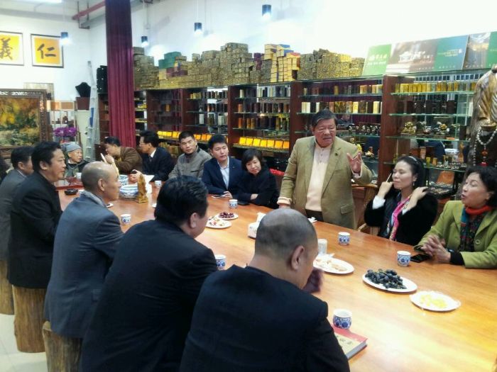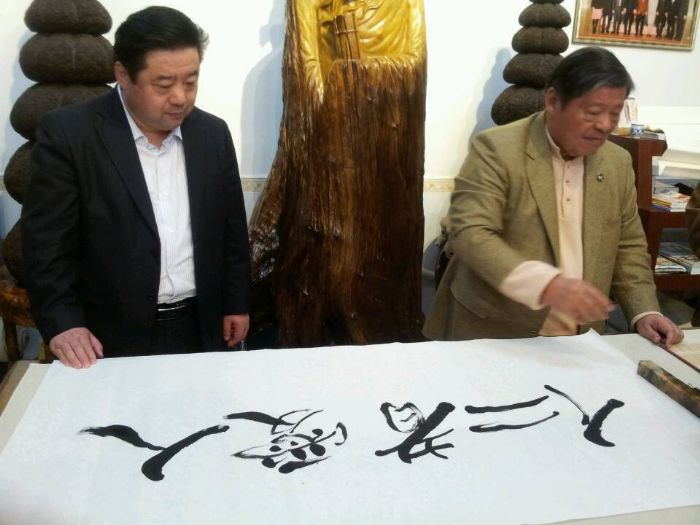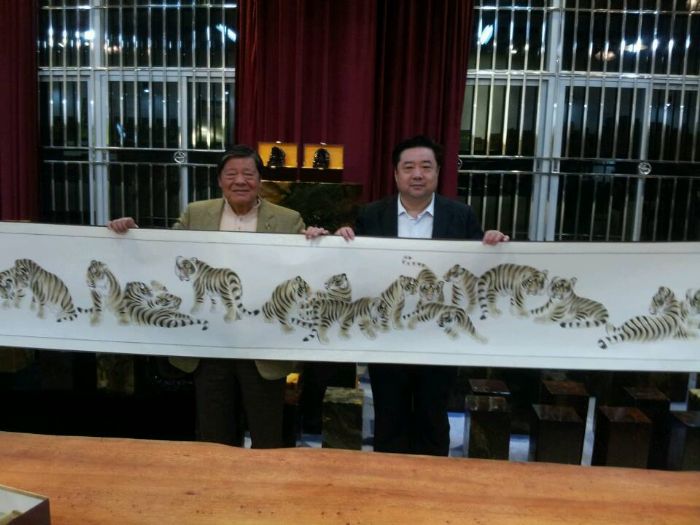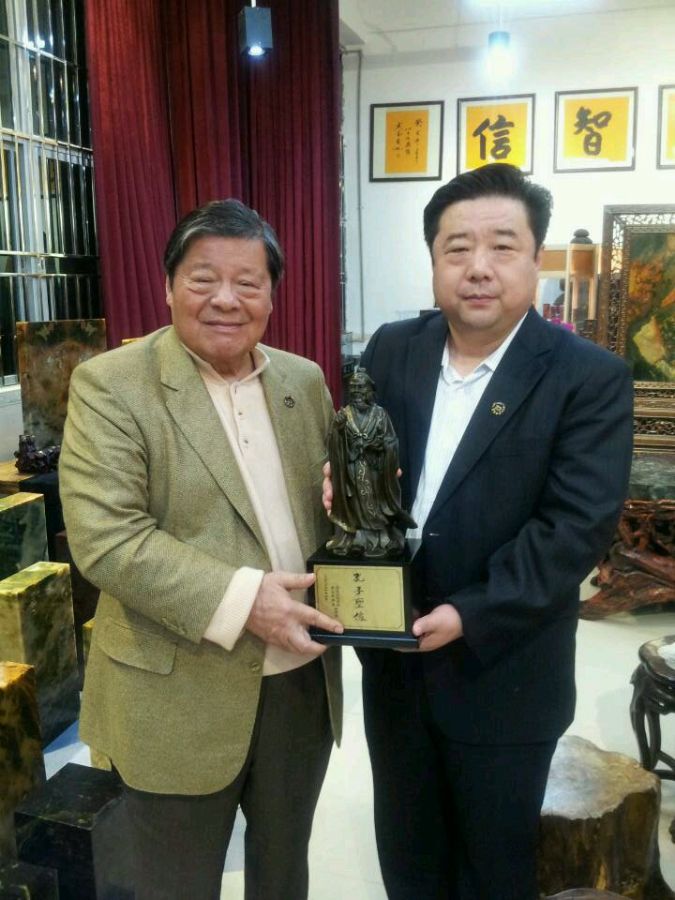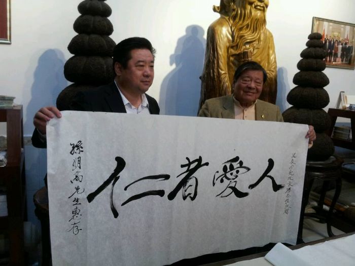 晚宴后,兴致正浓的汤恩佳院长又特邀孙明高会长一行前去孔春琼副院长的梦镇楼珠宝城共赏珠宝,期间汤恩佳院长又进行了热情洋溢的近一小时的孔子思想演讲,对如何弘扬儒家文化、如何对待日本表明了自己旗帜鲜明的观点,赢得大家阵阵热烈的掌声。期间汤恩佳院长为孙明高会长的渊博知识所感动,将诚邀孙明高会长为世界孔学院名誉院长,并挥毫为孙明高会长写下了“仁者爱人”四尺横幅,为了答谢汤恩佳院长,孙明高会长为汤恩佳院长赠送了《白虎图》20米长卷,汤恩佳院长又为孙明高会长赠送了一尊孔子雕像。
