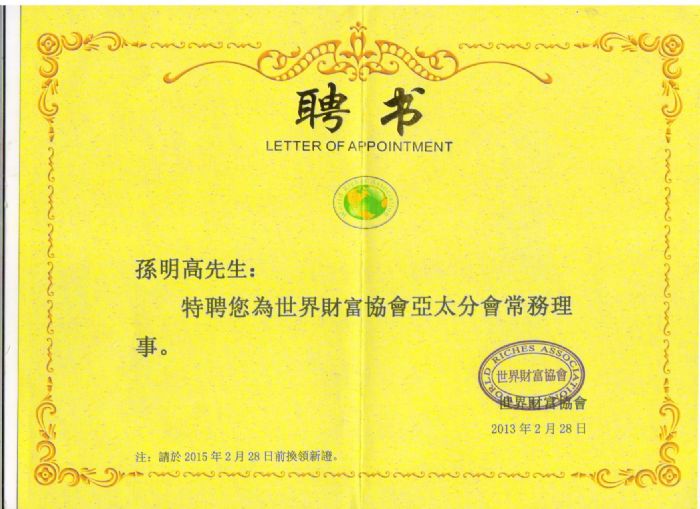 为了更好的推动全球资源整合,促进全球经济活动的健康可持续发展,世界财富协会特聘孙明高会长为协会亚太分会常务理事。