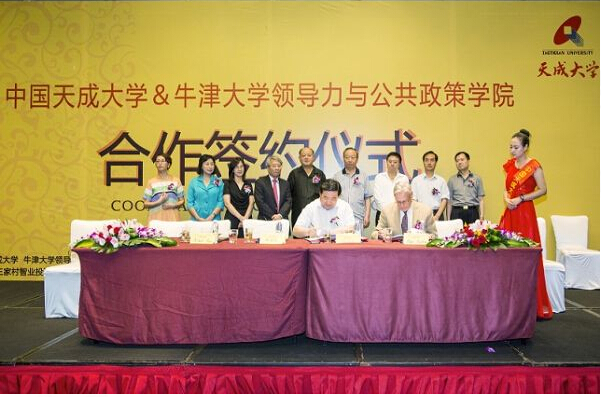 中国天成大学是一所集科研、培训、教育、社会化服务、印刷出版、会议会展、管理咨询、资产管理、财富管理、基金服务于一体的综合性企业大学。大学为各级党政机关及地方政府和社会组织提供经济规划、城市信息化培训和招商引资服务,并为各类企业打造创业家、企业家和金融家。英国牛津大学历经9个世纪的积累和沉淀,如今发展成为一所拥有30多个学院、1万多名在校学生的综合性大学。牛津大学以自然科学和应用经济科学、商务管理哲学三大学科称雄全球,同时也以丰富多样的教学方法声名远扬。此次双校联姻,共襄盛举,进一步促进了中英两国的教育合作,让更多的牛津师生有机会到中国来交流,也让更多的中国学生有机会进入牛津去求学,不仅翻开了中国教育史的崭新篇章,也为中英两国的文化交流、知识融合和思想碰撞,在中华大地这片丰富的沃土上提供了辽阔的发展空间。