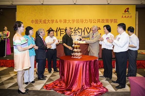一个是英语世界中最古老的大学,一个是以人为本的创新型企业大学;一个是在世界上享有顶尖大学声誉、巨大影响力的知名学府,一个是包含十大管理中心、十个专业学院、两个博士后工作站的知名企业大学。英国牛津大学和中国天成大学两个在教育领域均有着较高教学质量的学府,在2014年6月11日达成战略合作协议,在中国共同设立教育中心。这份协议的签署标志着世界排名前三的牛津大学将在中国落地生根,从此,走出国门才能享受世界一流名校的高等教育将成为过去,未来不用出国也可以为众多莘莘学子圆梦,在国内就能实现求学牛津的理想。中国齐鲁文化促进会执行会长、中国武警部队原副司令、副政委刘世民,深圳市人大常委、人大教科文卫工委主任汪开国,深圳市政协常委、政协社法民宗委主任李振河,广东省侨联副主席、深圳市政协委员孔爱玲共同见证此次签约仪式。