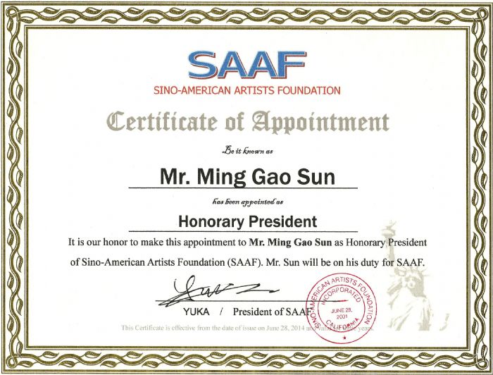 2014年6月28日,经美国中美艺术家基金会(SAAF)理事会研究决定,聘请深圳市齐鲁商会孙明高会长为美国中美艺术家基金会荣誉会长,聘期三年。