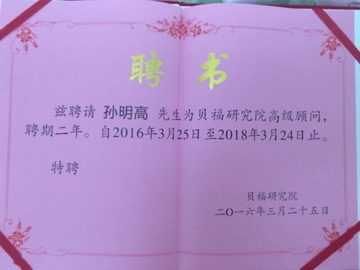 这次受聘为贝福研究院高级顾问,孙明高会长深感荣幸,他表示,今后还将集合八方资源,为繁荣社会经济,建设社会精神文明,贡献自己的绵薄之力。