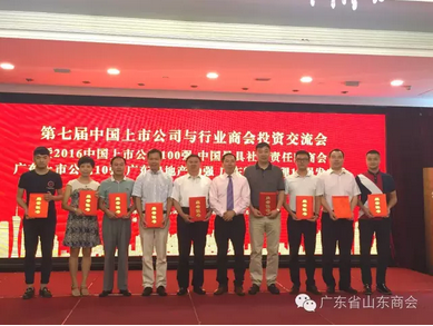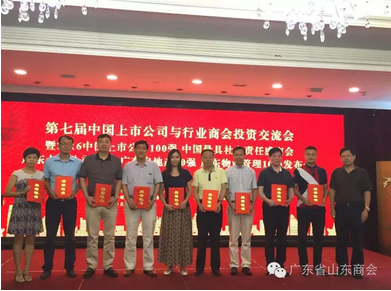 由中国知名品牌研究院、中国上市公司发展研究院主办的“第七届中国投资合作交流会暨2016年中国最佳营商环境城市、中国最具社会责任商会/会长、中国驻粤商会优秀秘书长、中国上市公司100强企业发布会”于2016年7月18日上午在广东迎宾馆胜利召开。我商会被评为“2016年中国最具社会责任感商会”、“2016中国最具社会责任感商会会长”、“2016中国驻粤商会优秀秘书长”。我商会李建国监事长代表领取了“2016年中国最具社会责任感商会”、“2016中国最具社会责任感商会会长”的荣誉证书,周慎坤秘书长领取了“2016中国驻粤商会优秀秘书长”的荣誉证书。