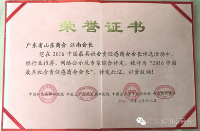 广东省山东商会监事长李建国代表江南会长领取2016中国最具社会责任感商会会长荣誉证书