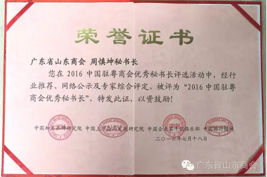 广东省山东商会周慎坤秘书长获得2016中国驻粤商会优秀秘书长