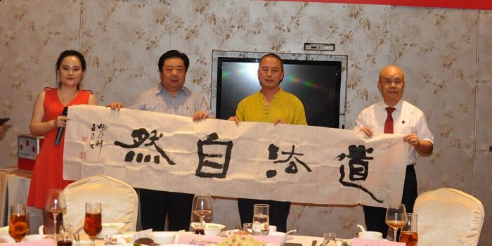 齐鲁文化研究会副会长盛方良为商会献上墨宝,笔力劲挺的墨宝呈现出山东人道法自然的老子文化。