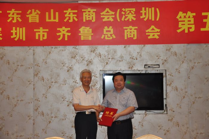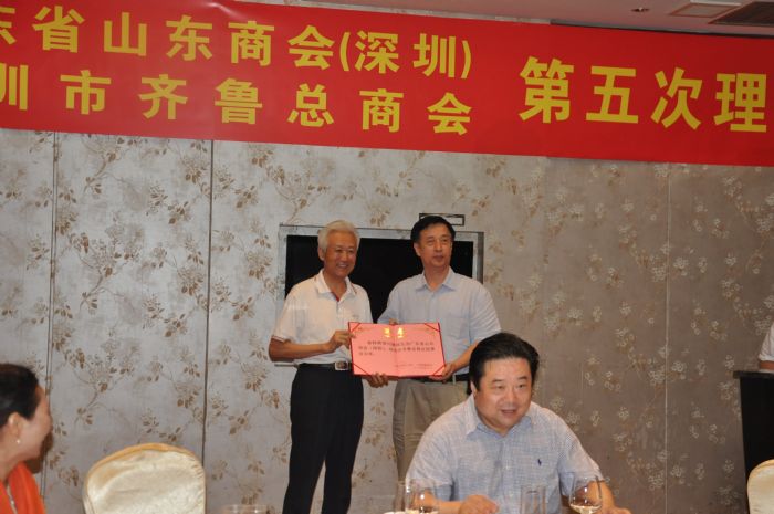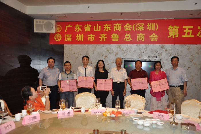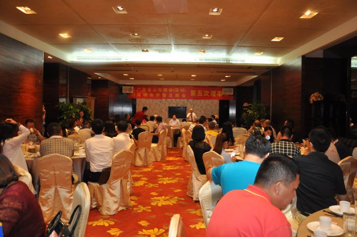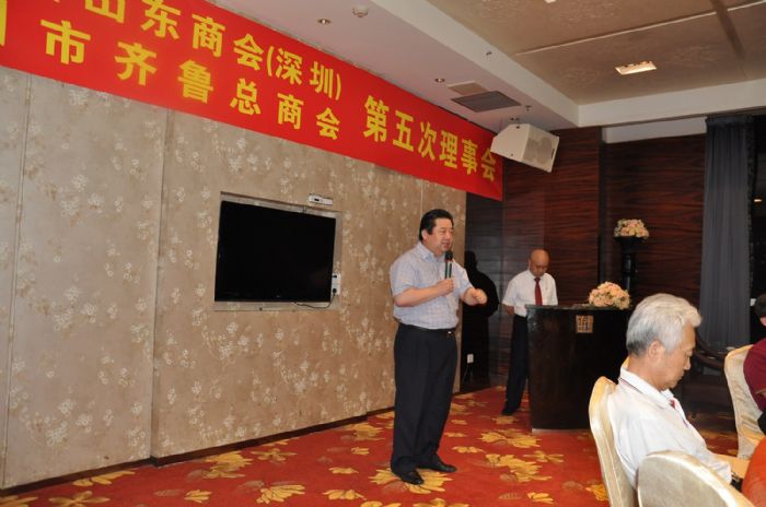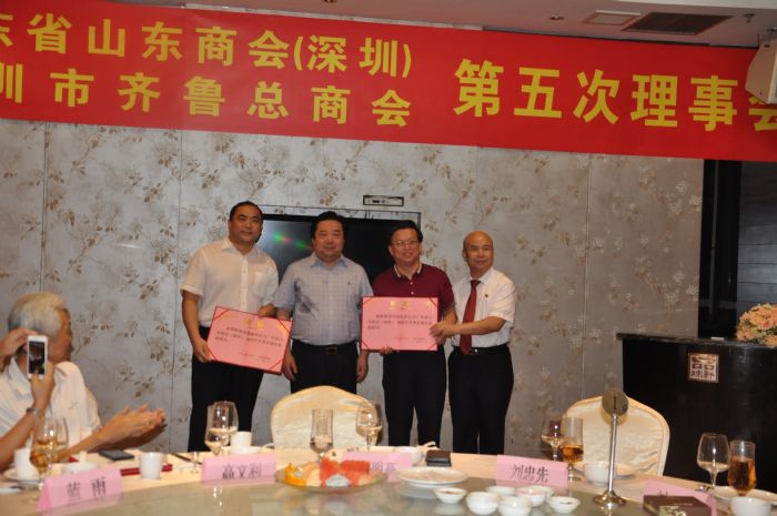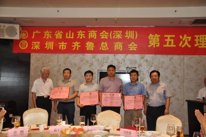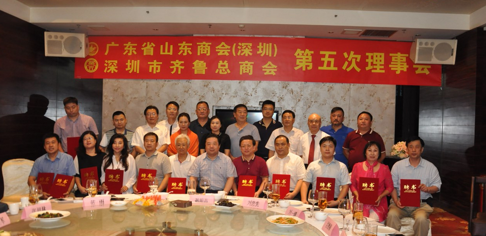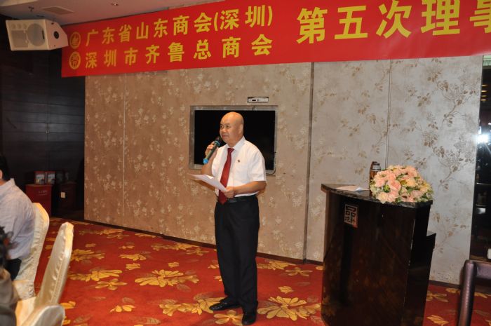 金秋时节,丹桂飘香,2016年9月14日,广东省山东商会(深圳)、广东省山东商会深圳分会第五次理事会在深圳皇庭V酒店品味轩隆重召开。来自商会70多位理事及代表参加了此次会议。莅临本次大会的主要领导有原中央财经领导小组办公室课题组组长,中农汇银集团董事长高文利先生;深圳乐天成控股集团董事长、广东省山东商会深圳分会、深圳齐鲁文化研究会会长孙明高先生;广东省山东商会深圳分会、深圳齐鲁文化研究会监事会主席刘健先生;中建八局华南分局总经理、广东省山东商会深圳分会常务副会长张福林先生;浪潮集团副总裁、广东省山东商会深圳分会副会长孙立新先生;慈铭体检深圳总经理、广东省山东商会深圳分会副会长刘发军;亨圆铜业董事长、广东省山东商会深圳分会常务副会长燕志富先生;中非经济促进会会长,广东省山东商会深圳分会功勋副会长刘一臻女士;深圳聊城山东商会会长、广东省山东商会深圳分会功勋副会长李正文先生;山东德兴集团创始人,广东省山东商会深圳分会副会长王武清先生;广东省山东商会深圳分会副理事长刘立华先生。特邀嘉宾有富士康党委书记刘忠贤先生、粤商集团总裁孟德禄先生、山钢集团金融控股集团副总裁闵现金先生、山钢集团金融控股集团资产管理公司副总辛帅先生等人出席本次大会。大会由广东省山东商会深圳分会副会长王北洋先生主持。