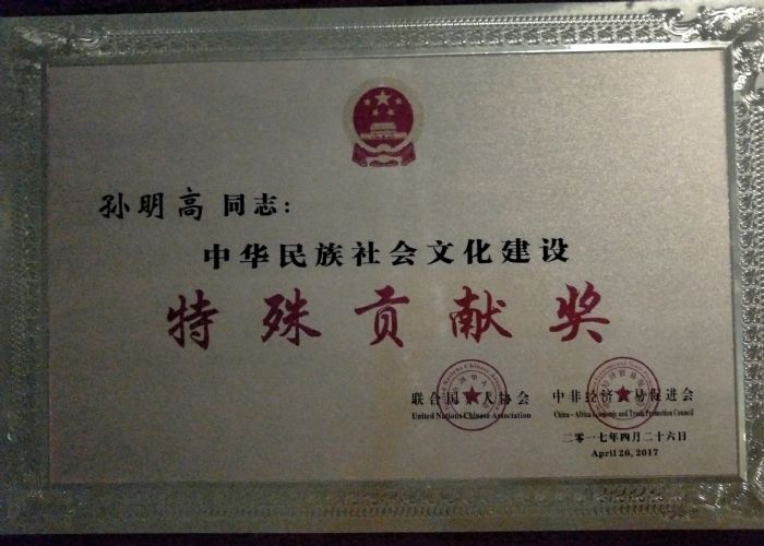 孙明高会长通过多年的辛勤付出与努力、坚持与倡导、大力推行并践行社会主义核心价值观,光大中华社会文化事业,并取得了非凡的成就,赢得了社会各界的广泛认可和赞誉。由此联合国华人协会、中非经济贸易促进会特别决议授予孙明高会长“中华社会文化事业特殊贡献奖”,以此表彰孙明高会长的付出,及对中华社会文化事业的特殊贡献。