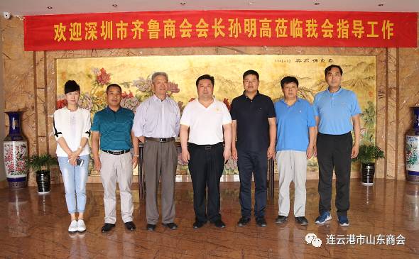 6月7日上午,广东省山东商会深圳分会会长孙明高先生一行前往连云港市山东商会交流指导工作。连云港市山东商会会长王通、顾问刘润忠、王之祥、王世厚,常务副会长王济明等参与接待并参与座谈。