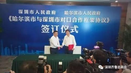 10月11日上午,深圳哈尔滨对口合作经贸洽谈推介会在深圳五洲宾馆举行,两市正式签署《哈尔滨市与深圳市对口合作框架协议》。国家发改委振兴司副司长童章舜,深圳市委副书记、市长陈如桂,深圳市副市长陈彪、市政府秘书长李廷忠,哈尔滨市委副书记、市长宋希斌,哈尔滨市副市长张万平、市政府秘书长赵革等参加活动或致辞。深哈两市相关部门、区县(市)政府领导及企业负责人等500余人参加推介会,全国山东商会战略联盟副主席、广东省山东商会(深圳)、广东省山东商会深圳分会会长孙明高先生应邀出席推介会,广东省山东商会深圳分会副会长王成先生陪同出席。