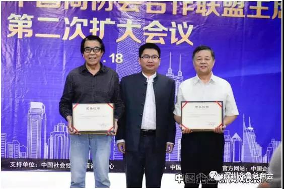 辜卢密主任为唐善新、何五星两位专家颁发中国商协会合作联盟顾问聘书和牌匾