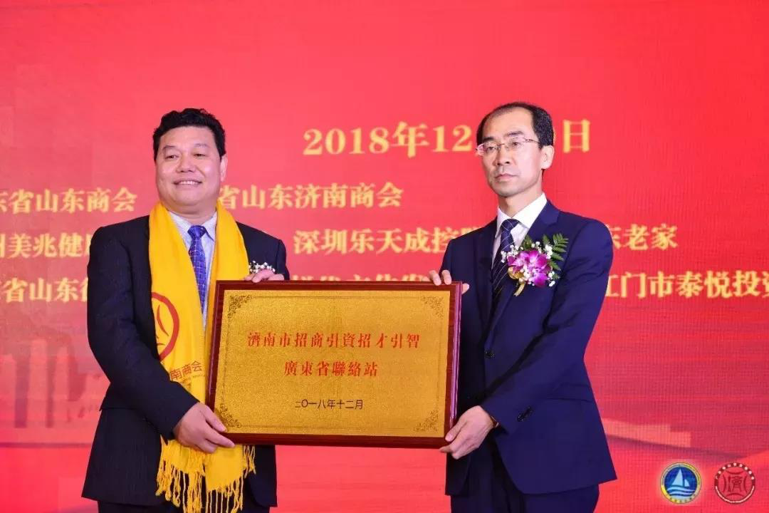 济南市委常委、统战部部长王拥华为广东省山东济南商会首任会长王军船颁发牌匾;广东省山东商会江南会长向王军船会长颁发广东省山东商会济南分会牌匾;济南市政府李自军副市长向济南商会颁发济南市“双招双引”广东联络站牌匾;广东省山东商会秘书长周慎坤代表广东省山东商会向广东省山东济南商会会长王军船赠送“一帆风顺”金船礼品。