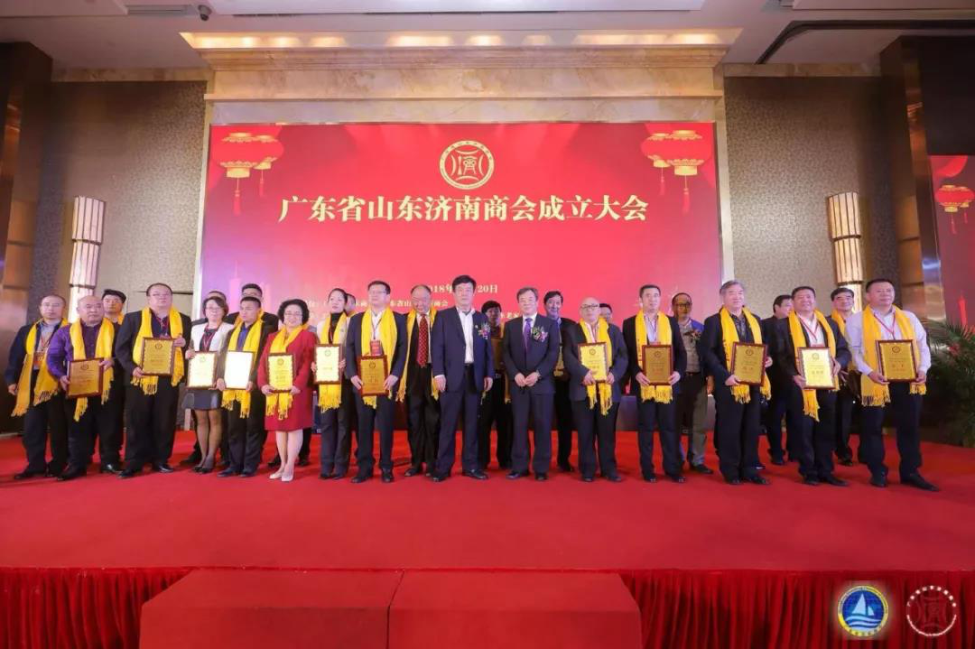 于化空监事长宣读广东省山东济南商会第一届理事会会长、监事长、执行会长、常务副会长、副会长、副监事长、秘书长、理事、副秘书长名单,孙明高会长荣任广东省山东济南商会名誉会长。济南市委统战部副部长、工商联党组书记张鹏为广东省山东济南商会名誉会长颁发牌匾。