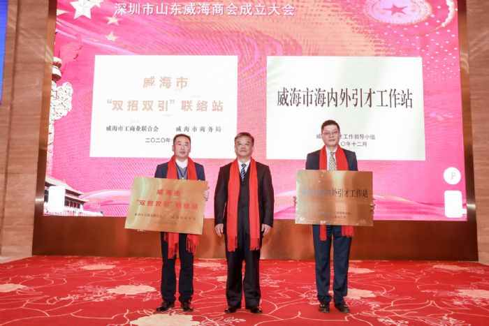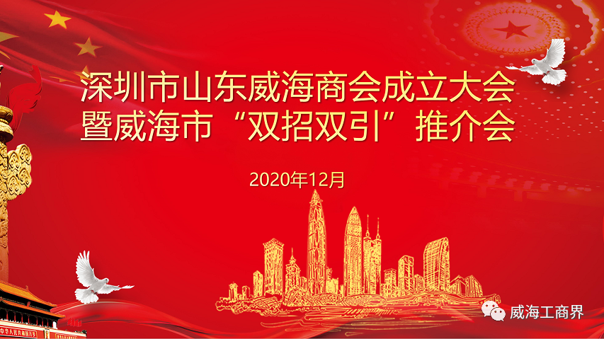 2020年12月20日,深圳市山东威海商会成立大会暨威海市“双招双引”推介会在深圳市成功举办。深圳市有关部门领导,在深各界威海籍知名人士,威海市直有关部门及各区市、国家级开发区领导,深圳市山东威海商会领导班子及会员近300人参加活动。威海市委常委、统战部部长梁金光,威海市委统战部副部长、市工商联党组书记、副主席陈文,威海市工商联党组成员、副主席、威海市总商会党委书记夏忠平,上海市威海商会名誉会长徐曙光,鲁商联盟会常务副会长、广东省山东商会常务副会长、广东省山东烟台商会会长孙明高,深圳市山东威海商会会长于英浩、执行会长鞠明轩等领导出席了大会。