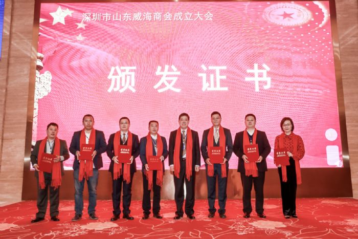 陈文副部长为深圳市山东威海商会第一届理事会、监事会成员颁发证书。