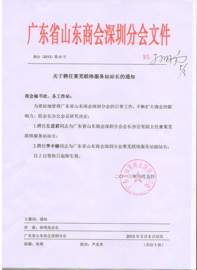 关于聘任莱芜联络服务站站长的通知