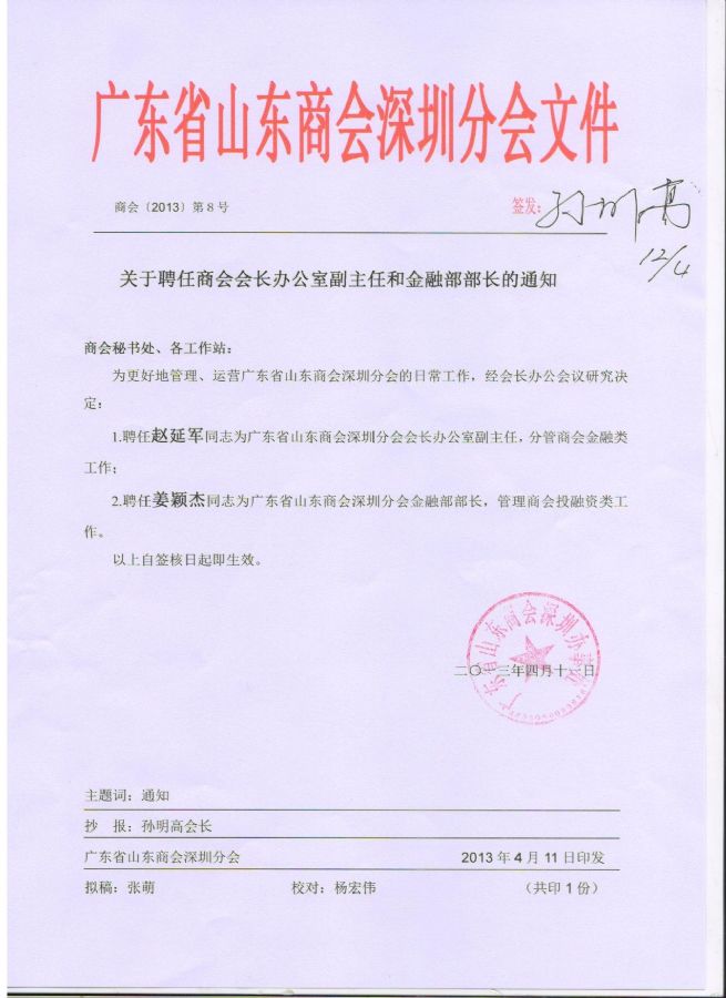 关于聘任商会会长办公室副主任和金融部部长的通知