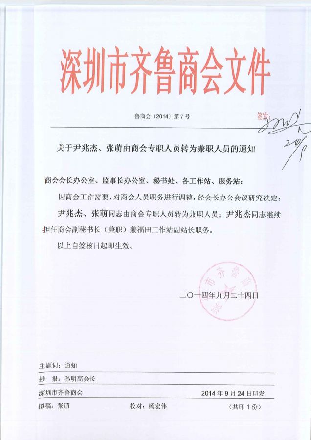 关于尹兆杰、张萌由商会专职人员转为兼职人员的通知