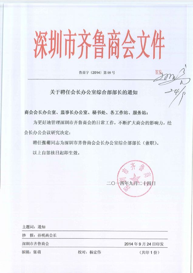 关于聘任会长办公室综合部部长的通知