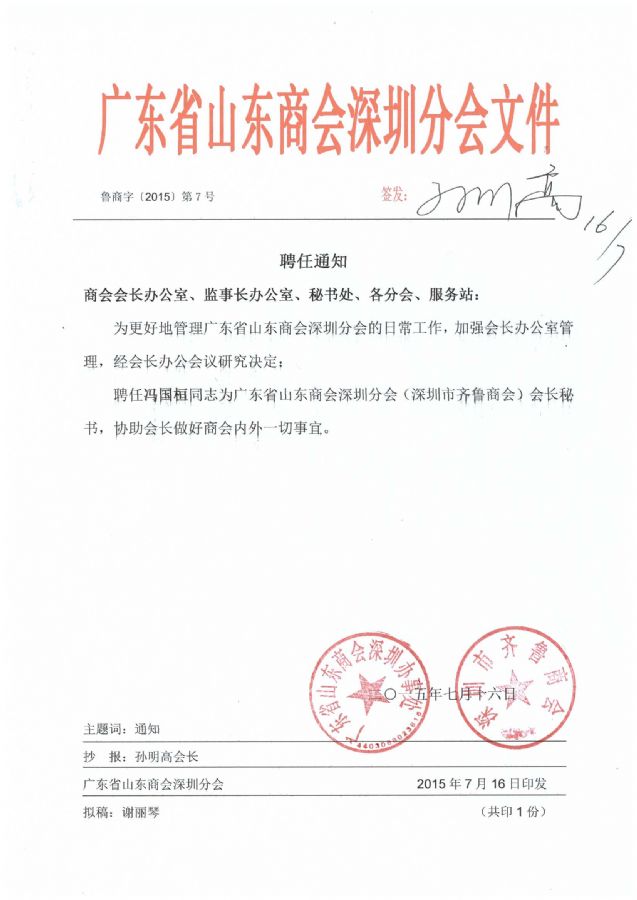 关于冯国桓先生的聘任通知