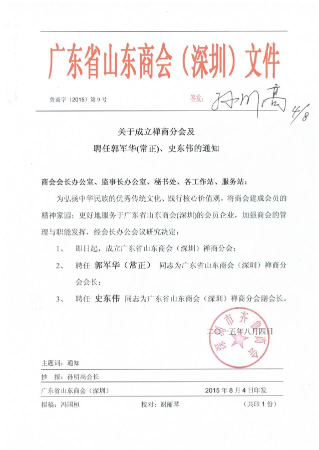 关于成立“禅商分会”及聘任郭军华(常正)会长、史东伟副会长的通知