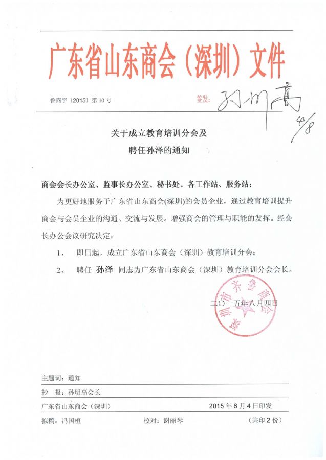 关于成立“教育培训分会”并聘任 孙泽会长的通知