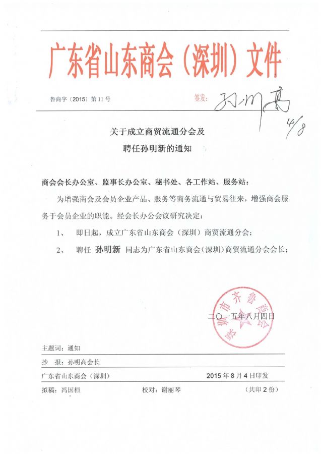 关于成立“商贸流通分会”并聘任孙明新会长的通知
