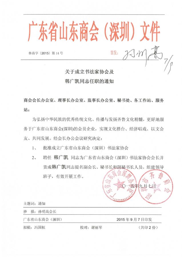 关于成立书法家协会及 韩广凯同志任职的通知