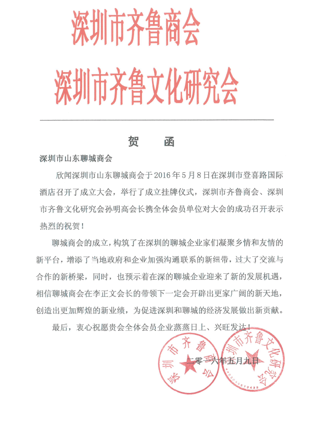 深圳市山东聊城商会于2016年5月8日在深圳市登喜路国际酒店召开了成立大会,举行了成立挂牌仪式,深圳市齐鲁商会、深圳市齐鲁文化研究会会长孙明高作为嘉宾应邀参加成立大会,并代表商会全体会员对大会的成功召开表示祝贺!