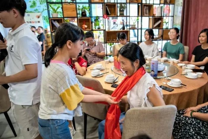 来到现场的七个孩子代表以自己特有的方式,感谢现场来宾。纷纷为叔叔阿姨们送上红红的缎带,送上美好祝福。孩子们脸上挂着甜美又单纯的笑容,以茶代酒,真切地道了声“谢谢”,深深打动了大家。