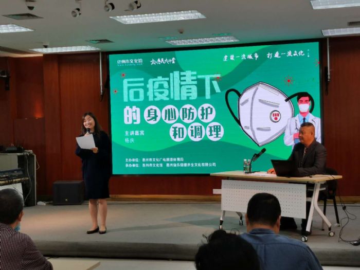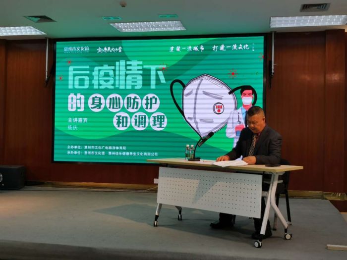 2020年10月28日,由惠州市文化广电旅游体育局主办,惠州市文化馆、惠州佳乐健康养生文化有限公司承办的文化惠民大讲堂在惠州市文化馆一楼多功能厅举行。特邀广东省山东商会深圳分会副会长兼医疗分会会长、鲁商名医杨庆博士作了《后疫情下的身心防护和调理》的专题讲座。