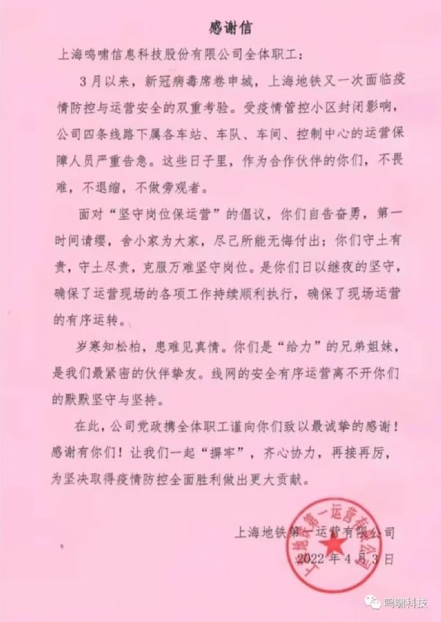 鸣啸科技MIT以郭伟卿为代表的地铁车站团队,在保证执行疫情防控的前提下,坚守自己本职工作不松懈,尽职尽责,勇挑重担,受到表彰。